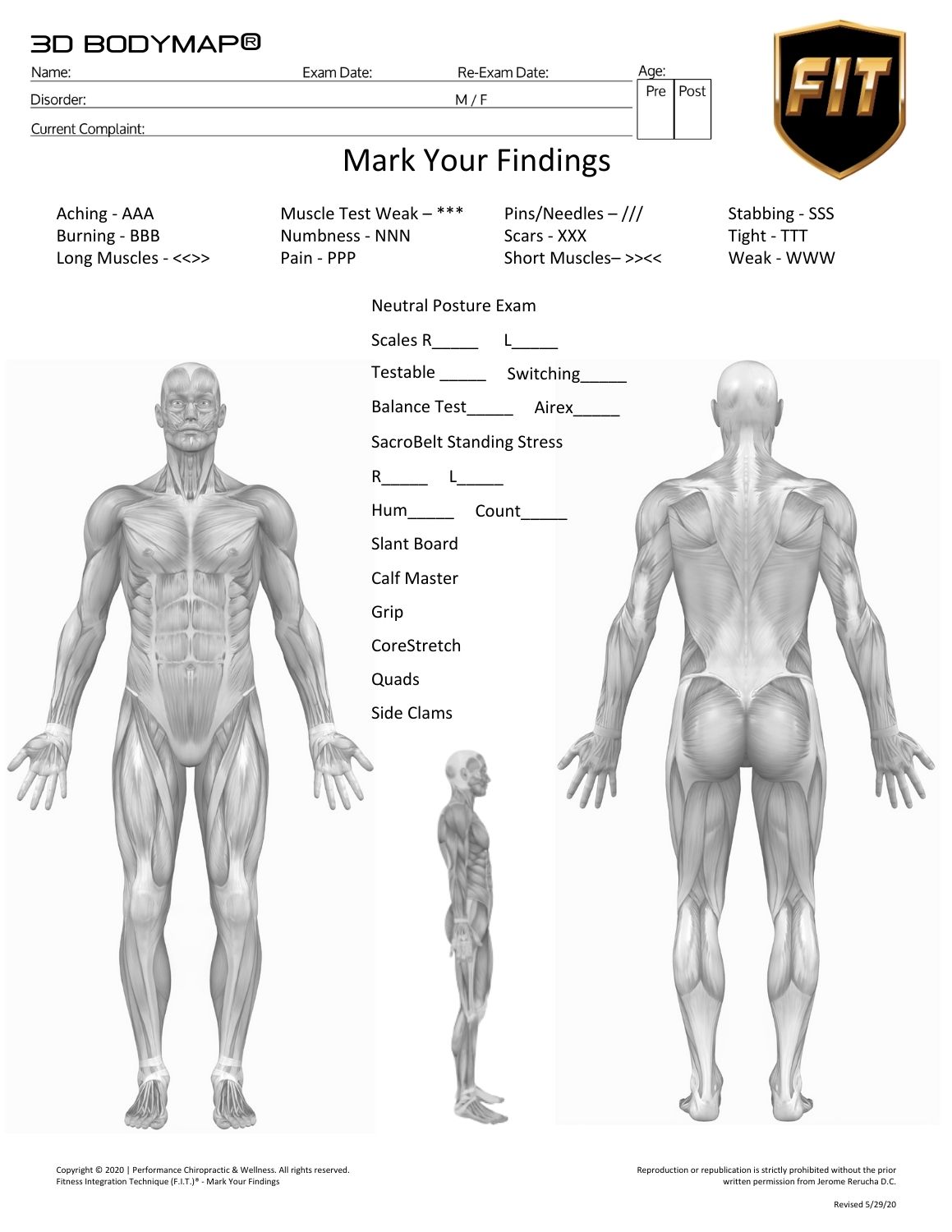 The numerous modules created in the entire FIT educational system organizes what all (integrative) clinicians need to begin learning from the basic level and display proficiency before learning and applying more education. The FIT System library provides academic understanding and hands-on training and competency including a progressive Bodymap®, 3D Body Mapping®, Brain Bodymap®, Brain/Body Map®, 3D Bodymap®, and the 3D Body Map®. These modules are scoring systems that are used to comprehensively teach integrated clinical exam methods, parallel and understand the symmetry/asymmetry of the brain body connection of a particular person and provide specific clinical treatment and clinical exercise based solutions. There is extensive academic understanding, hands-on testing, and proper documentation of medical findings and corrections in order for the clinician to progress. Starting with the Bodymap™ and improving through higher levels.