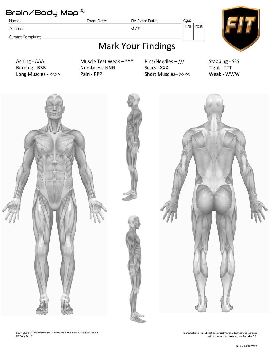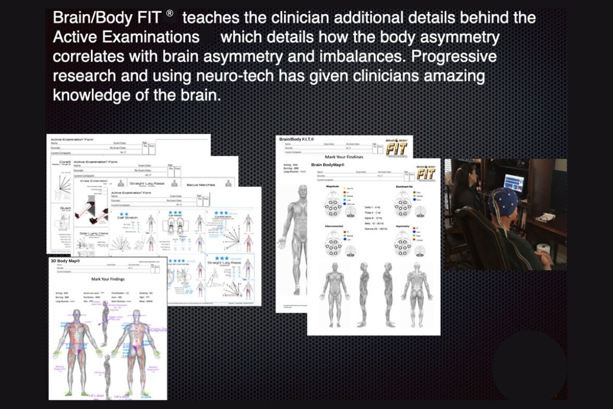 The numerous modules created in the entire FIT educational system organizes what all (integrative) clinicians need to begin learning from the basic level and display proficiency before learning and applying more education. The FIT System library provides academic understanding and hands-on training and competency including a progressive Bodymap®, 3D Body Mapping®, Brain Bodymap®, Brain/Body Map®, 3D Bodymap®, and the 3D Body Map®. These modules are scoring systems that are used to comprehensively teach integrated clinical exam methods, parallel and understand the symmetry/asymmetry of the brain body connection of a particular person and provide specific clinical treatment and clinical exercise based solutions. There is extensive academic understanding, hands-on testing, and proper documentation of medical findings and corrections in order for the clinician to progress. Starting with the Bodymap™ and improving through higher levels.
